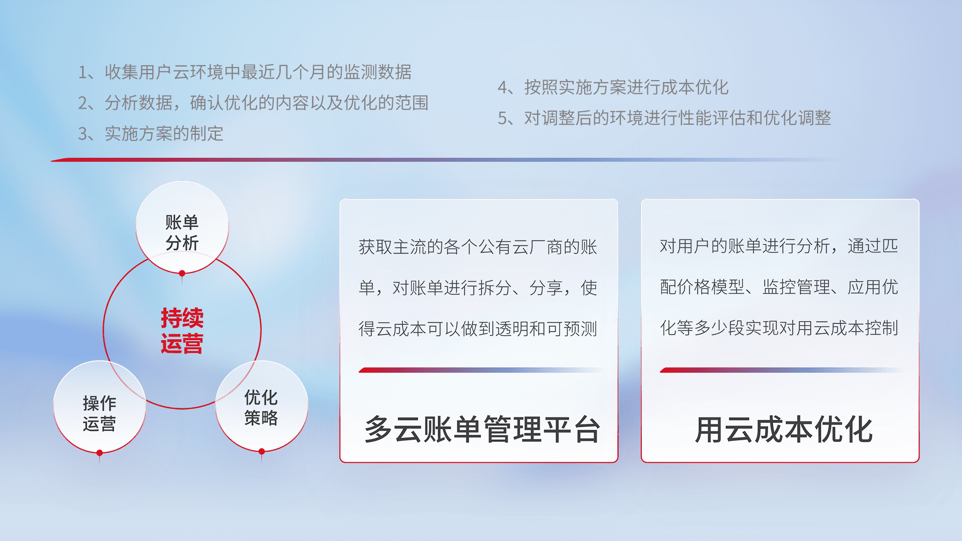 通过多云纳管,,,,以统一的资源数据模型把客户的云资源进行抽象和封装,,进而实现对多云资源的统一操作,,,,保障云资源管理的可靠性、、、稳定性与可用性。。。量身定制化运维内容,,,配置、、开发运维、、、补丁管理、、备份、、、、监控、、、、认证和访问管理、、、审计和日常巡检等,,,,保障在用云过程中的可靠度,,,,稳定度以及高可用率。。。。